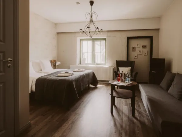 Meidän isommissa, Premium, huoneissa on 180 cm leveä parisänky. Huoneet on sisustettu loft-tyyliin ja niissä on kotoisa oleskelualue. Premium huoneissa on omat kylpyhuoneet sadesuihkulla, televisio sekä vedenkeitin ja kahvia ja teetä. Yhdessä huoneessa on mahdollisuus varavuoteeseen joko yhdelle aikuiselle tai yhdelle tai kahdelle lapselle. Aamiainen sisältyy huoneen hintaan ja tarjoillaan asiakkaan aikataulun mukaan.